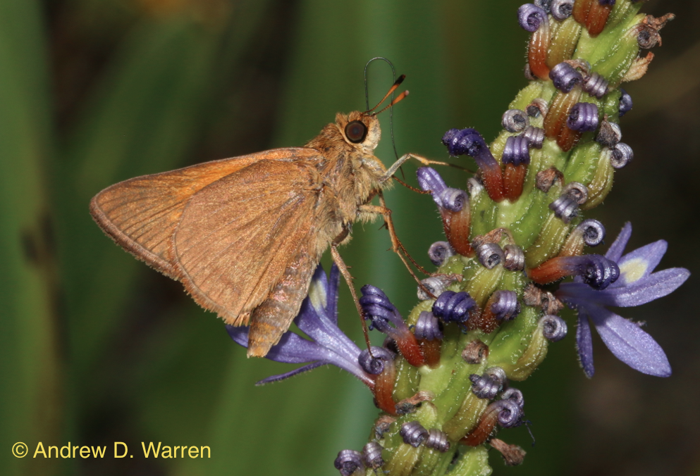 The Palatka Skipper (Euphyes pilatka) is the largest member of its genus, restricted to the southeastern USA.  It is especially fond of Pickerelweed (Pontederia cordata) flowers, as shown above, and adults may spend many minutes on a cluster of these extraordinary flowers.  The only downside is you pretty much always have to go wading, up to knee-deep, to get close to the blooms.