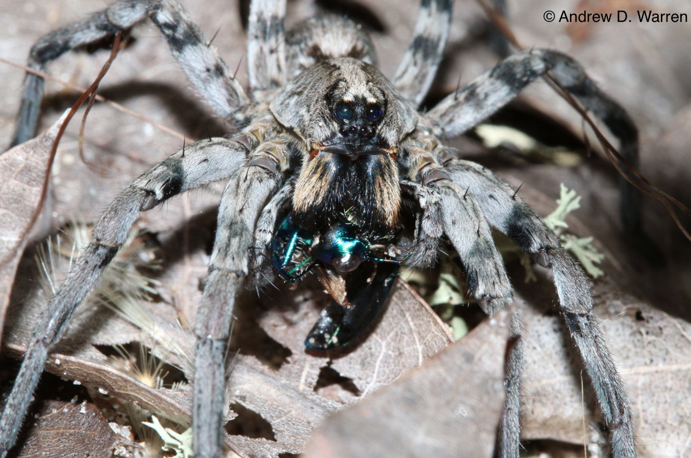 Wolf Spider (Hogna sp.) eating a Festive Tiger Beetle (Cicindela scutellaris unicolor), FLORIDA: Levy Co.: Bronson, 24-XI-2013